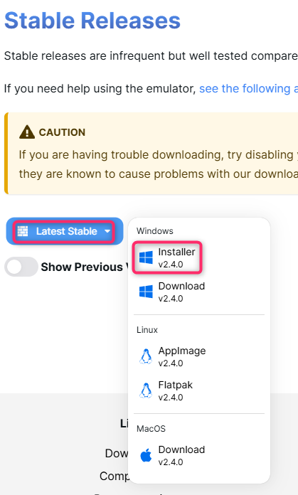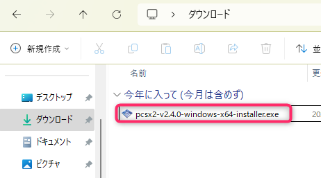 PCSX2の公式ページから、PCSX2をダウンロードします。筆者は、Stable Releases(安定版)のインストーラをダウンロードしました。