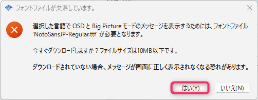 続いて下の「フォントファイルが欠落しています。」というメッセージが表示された場合は、[はい]をクリックしてフォントをダウンロードします。